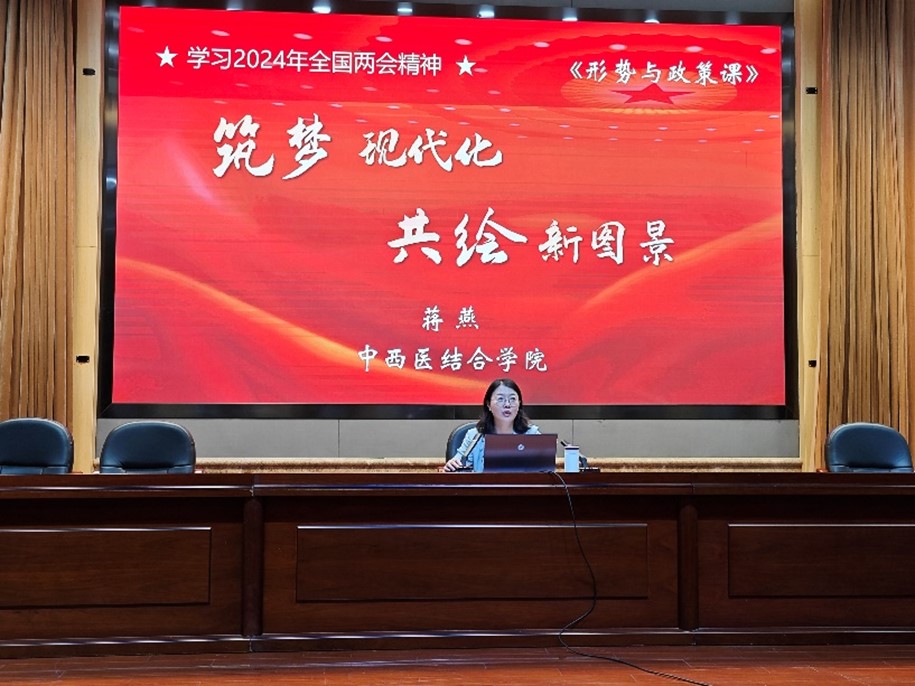 5月23日下午,中西医结合公司党总支书记蒋燕以“筑梦现代化,共绘新图景——学习2024年全国两会精神”为主题,为2023级全体员工讲授课程。