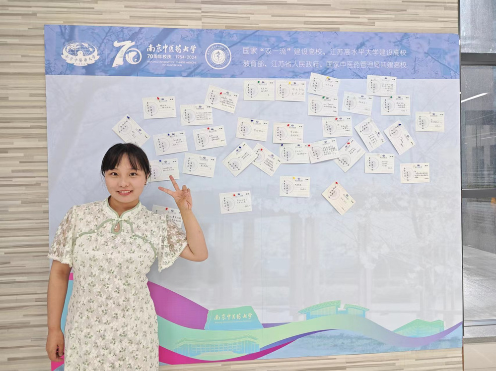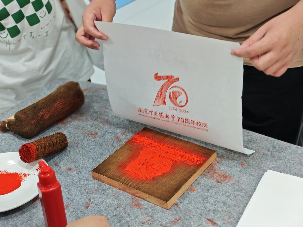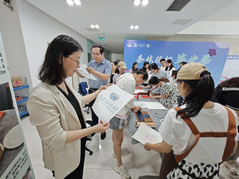 同时学院联合图书馆为毕业生提供纪念印章打卡、雕版印刷体验活动,活动现场设置了献礼校庆明信片留言板。毕业生在学院纪念本上印上南中医校徽、太阳成集团122ccvip院徽、70周年校庆标识等印章,通过雕版印刷亲自体验印刷技术的魅力,印刷出南中医图标、中医经典书页等具有中医药文化特色的雕版画,在留言板上写下对母校70周年华诞的祝福,沉浸式参与让毕业生充分体会到浓浓母校情。