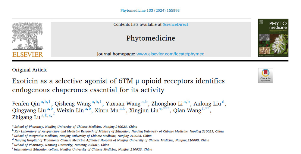 近期,太阳成集团122ccvip吕志刚教授团队在国际著名杂志Phytomedicine中科院医学一区Top期刊)上发表有关天然产物中特异性靶向μ阿片受体6次跨膜剪切异构体(6TM-MOR)的成果:“Exoticin as a selective agonist of 6TM μ opioid receptors identifies endogenous chaperones essential for its activity”