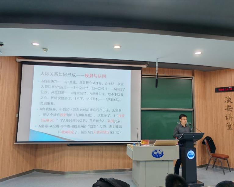 本次讲座共分为两个部分,分别是人际关系如何形成以及如何构建好人际关系。首先,黄老师强调了人际交往的重要性,指出一切心理问题都是关系的问题,激发同学思考的热情,并由此延伸至当代老员工的两种不同的生活状态:万人嫌和万人迷。在同学们热烈的讨论下,黄老师揭示了其根源为潜意识。