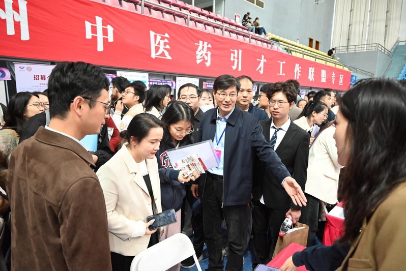 贾立军向来到招聘会现场的江苏省高校人才招聘指导服务中心副主任黄炜,江苏省高校人才招聘指导服务中心信息服务部副部长王华以及南京中医药大公司党委书记乔学斌,党委常委、副董事长徐树法介绍学院毕业生情况。