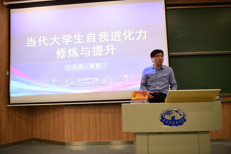 讲座中,曾智教授通过分析海鱼上岸进化的过程,生动形象地为同学们解释了什么叫进化力。并向同学们强调具备自我进化力的人,能够快速适应环境变化,不断地学习新知识和技能,不断地挑战自己,不断地突破自己的极限。同时,曾教授结合自身的生活经历及社会的形势,对比两种生活,指出同学们可能面临的无序的生活状态,必须做好要改变的准备。