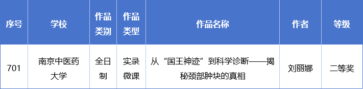 近日,2025年江苏省高等学校微课教学比赛获奖名单公示结束。公司中西医结合临床系副主任刘丽娜教授的作品《从“国王神迹”到科学诊断——揭秘颈部肿块的真相》在此次比赛中表现优秀,荣获全日制组实录微课二等奖。