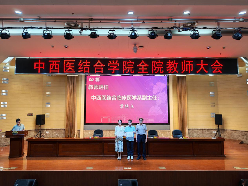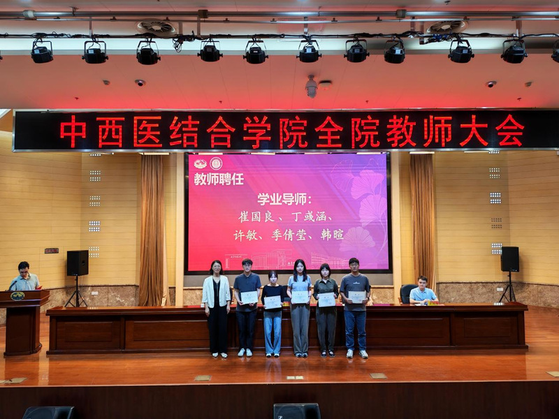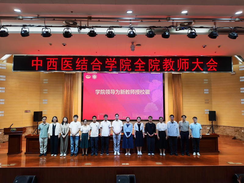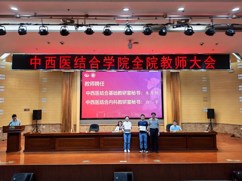 大会举行了学系、教研室及新生班级管理岗位聘任仪式。章轶立受聘为中西医结合临床医学系副主任,裴可受聘为循证与转化医学教研室副主任,朱丹阳、白宇分别受聘为中西医结合基础与内科教研室秘书。沃冠群、黄雯洁获聘2025级研究生班主任,崔国良、丁彧涵、许敏等受聘为2025级本科生学业指导老师。蒋燕书记和贾立军经理为受聘教师颁发聘书。学院领导还为杨道伟、王荣等新进教师佩戴校徽,标志着他们正式成为学院教师团队的一员。
