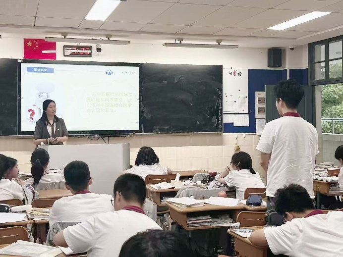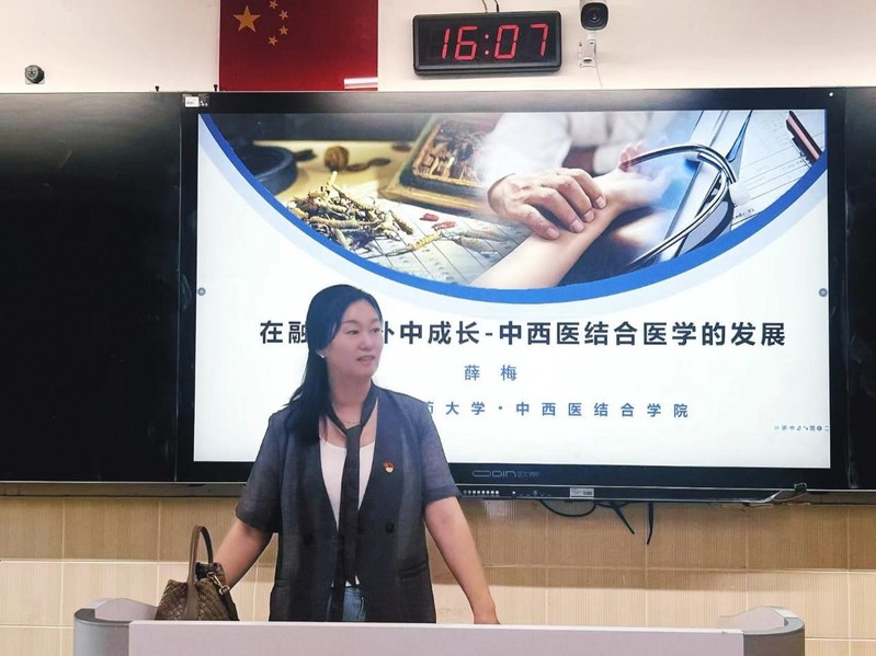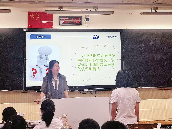 薛梅老师以“在融合互补中成长—中西医结合医学的发展”为主题,从中西医结合的概念、学科发展历程、基本要求、以及专业建设四个维度展开讲授。她系统梳理了中西医结合医学从初创到完善的发展脉络,指出其作为新理论、新方法、新医学科的理论创新与方法论特色,并辩证分析了中医整体观与西医精准医学各自的优势及互补潜力,她指出中西医结合需秉持“继承与发展并重、体用结合”的原则,既要扎根传统智慧,又要拥抱现代科技。她还介绍了公司专业的发展概况与建设成果,帮助高中生理解专业培养路径与发展前景。在课后互动环节,同学们结合自身体验与课堂所学踊跃发言,分享了对于中西医结合医学的见解,充分展现出对中医药文化的浓厚兴趣和多元思考。