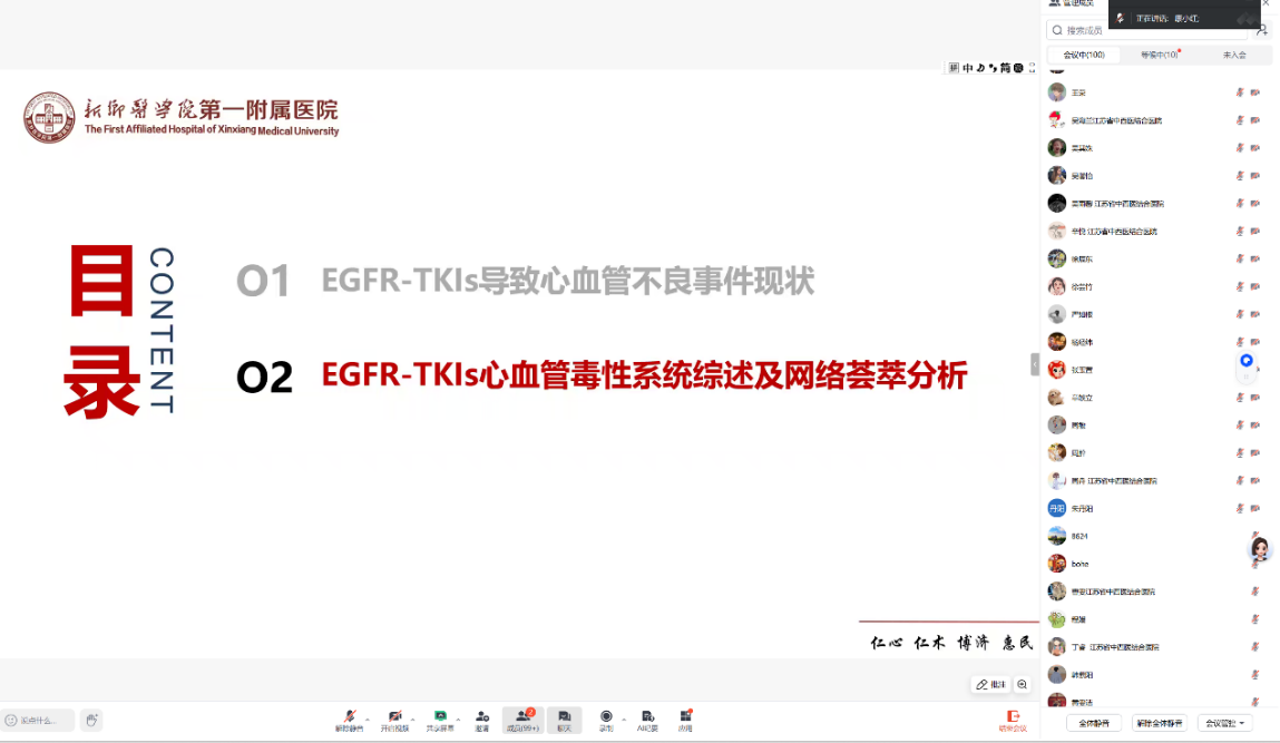 2025916日晚,公司与江苏省中西医结合医院线上联合举办灵素工作坊之“青研聚”系列讲座第五讲,河南医药大学康小红教授团队作“突变非小细胞肺癌中EGFR-TKIs治疗相关的心血管不良事件:系统综述和网状meta分析”的专题讲座。学院全体青年教师、研究生及江苏省中西医结合医院医生共同参与,线上参会超100人次。