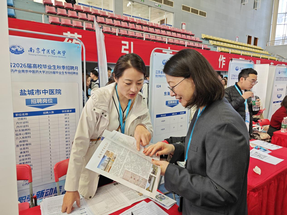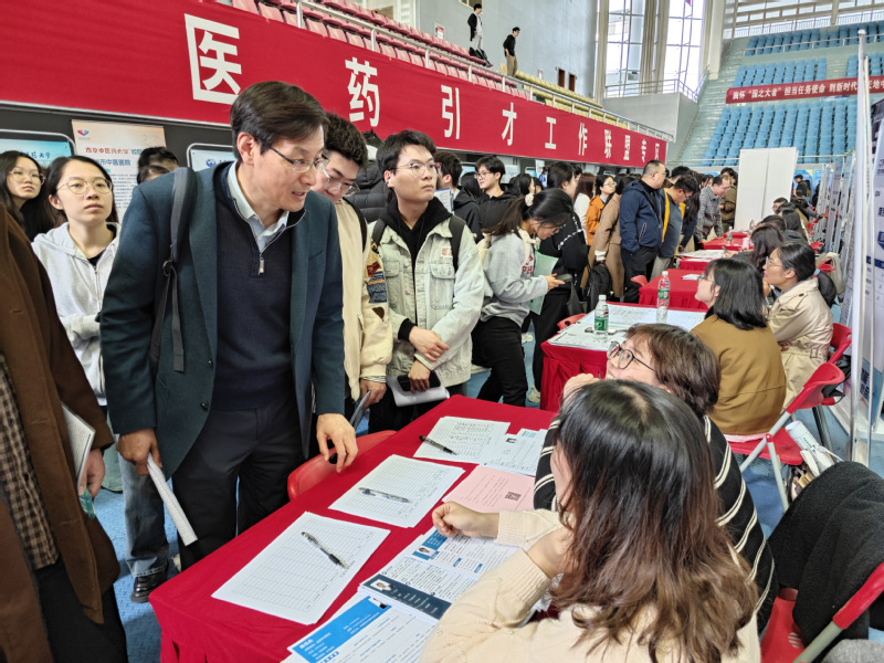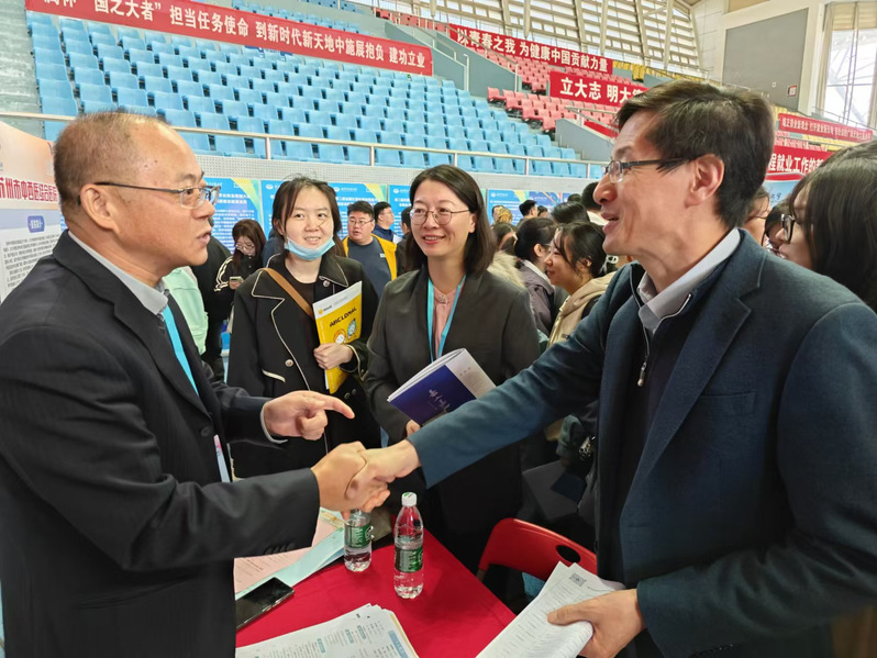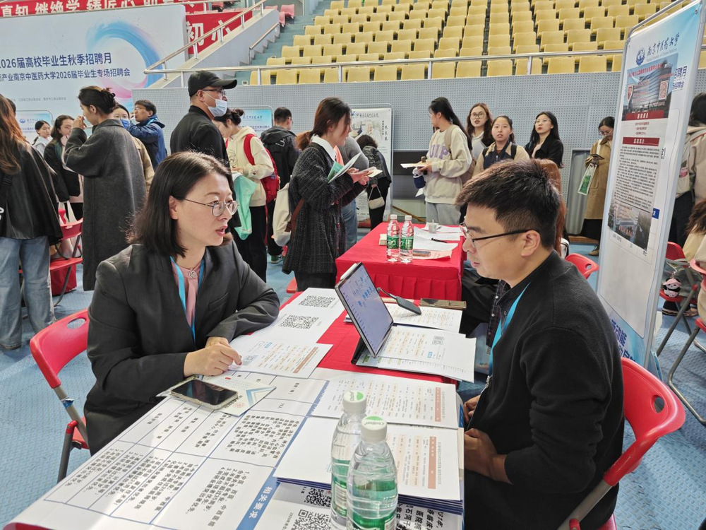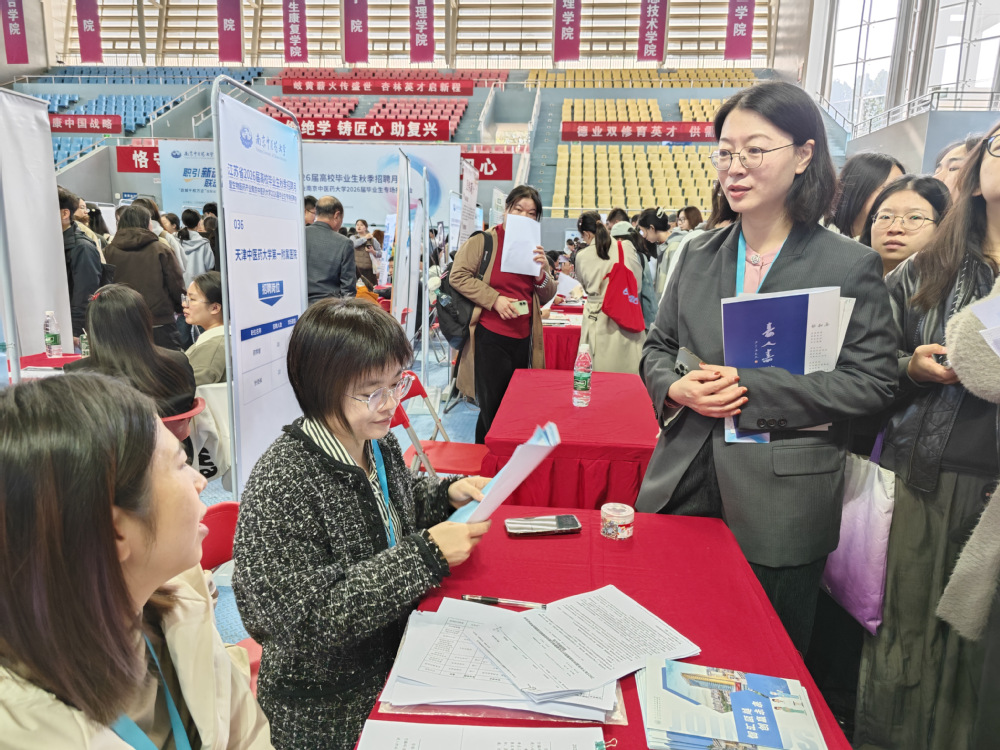 10月24日,“职引新动能 联动助启航”江苏省2026届高校毕业生秋季招聘月暨生物医药产业2026届毕业生专场招聘会在太阳成集团122ccvip仙林校区举行。为推进2026届毕业生就业工作,开拓更多就业资源,畅通就业信息传递渠道,中西医结合公司党总支书记蒋燕、经理贾立军、分管就业工作的分团委书记徐梓凌,来到招聘会现场访企拓岗,并推介学院专业与毕业生。