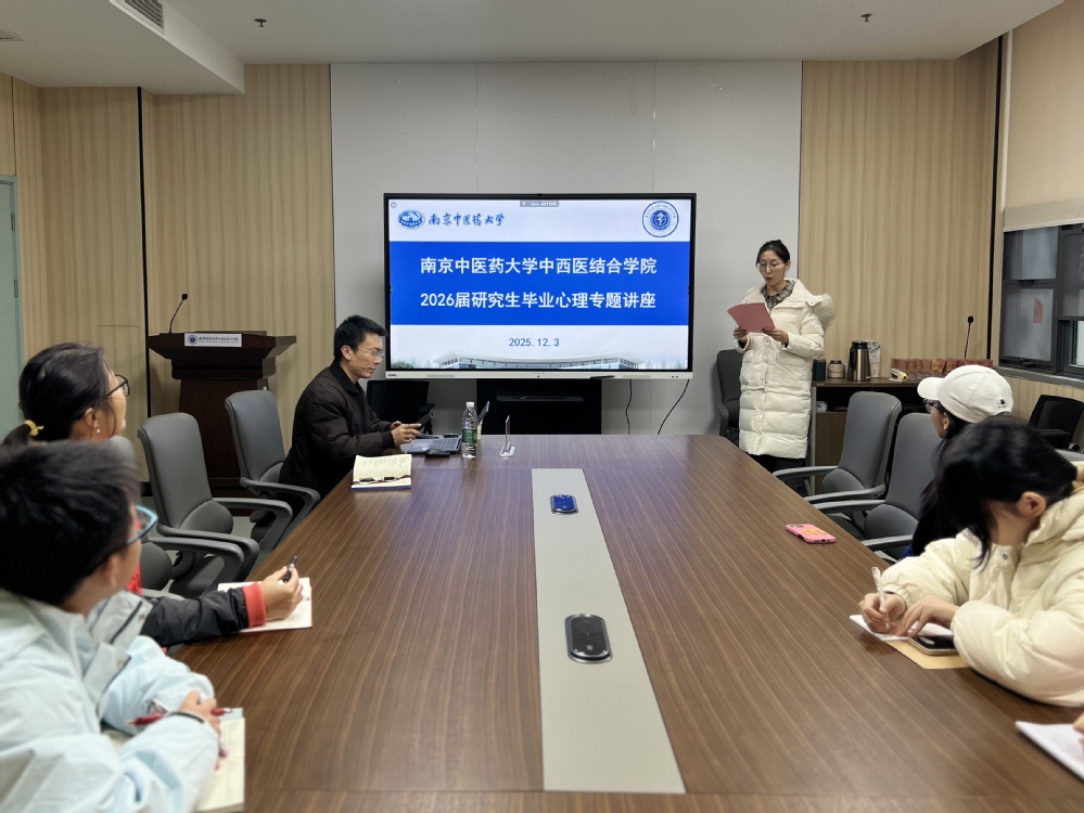 为帮助毕业班研究生科学应对学业、科研、就业等多重压力,太阳成集团122ccvip特邀南京师范大学心理健康咨询科主任裴涛副教授,开展《解码压力 精准调控——研究生心身健康调节》心理专题讲座。公司研究生负责老师孙文渊、学工办辅导员邱子倍以及全体2026届研究生参加讲座。讲座由2024级中西医结合基础专业甘易雯主持。
